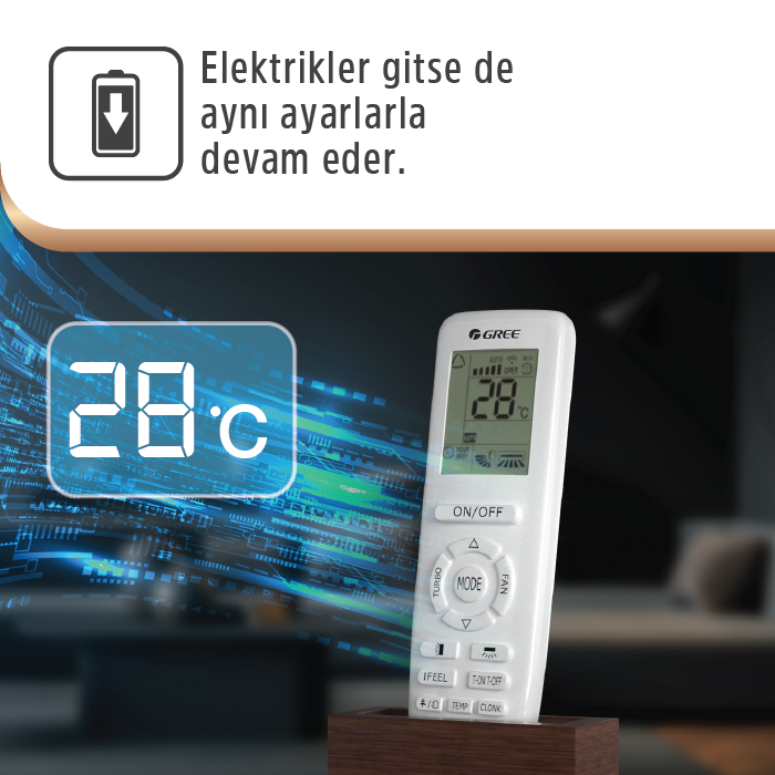 Gelecek normlarını baz alan opsiyonel Gree Smart (Wi-Fi) donanımı tedarik ettiğiniz zaman 24 bin btu gücündeki fırtınayı avuç içinizden (Android - Apple iOS üzerinden) saniyeler içinde zapt edebilirsiniz. Eve adım atmadan salonunuzu ısıtabilirsiniz. Bekleme modundayken sadece yarım (0.5) Watt çeken dev Aphro, siz kapat tuşuna bastığınızda pervane kanatçıklarını birkaç tur döndürür (X-Fan); bu temizleme işlemi nem yoğunlaşmasını içeride kurutarak bakteri kültürlerinin küf yapmasına imkan tanımaz. Elektrik hattı koparsa / sigorta atarsa / şebeke giderse endişe etmeyin: Elektrik geldiğinde kendi kendine eski son derece/ayarlarına (Auto Restart Modeli) otomatik dönmektedir.